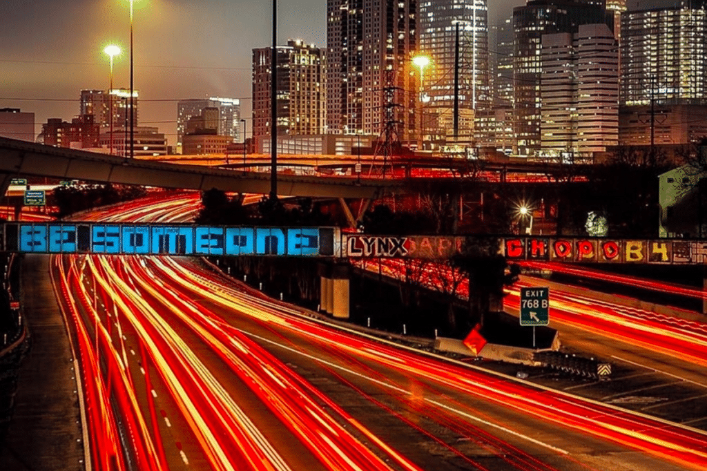 Specifically, to the “BE SOMEONE” graffiti tag that stretches above the freeway, a message that’s been there since his childhood.